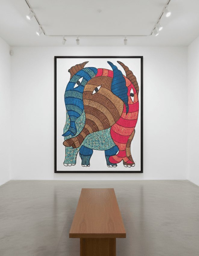 This striking Gond painting by Reshma Shyam features a group of elephants depicted in a vivid palette of red, blue, brown, and yellow.
