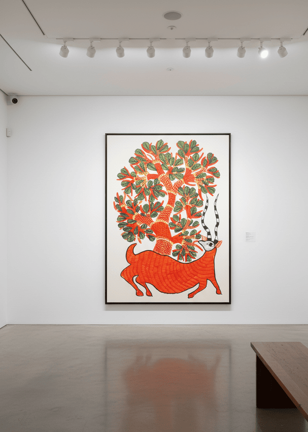 This lively Gond artwork by Dinesh Shyam portrays a bright red deer resting under a lush tree with patterned leaves and branches. The deer, with its distinct black-and-white horns, embodies grace and alertness, while the flourishing tree signifies growth, shelter, and the deep connection between animals and their natural surroundings.
